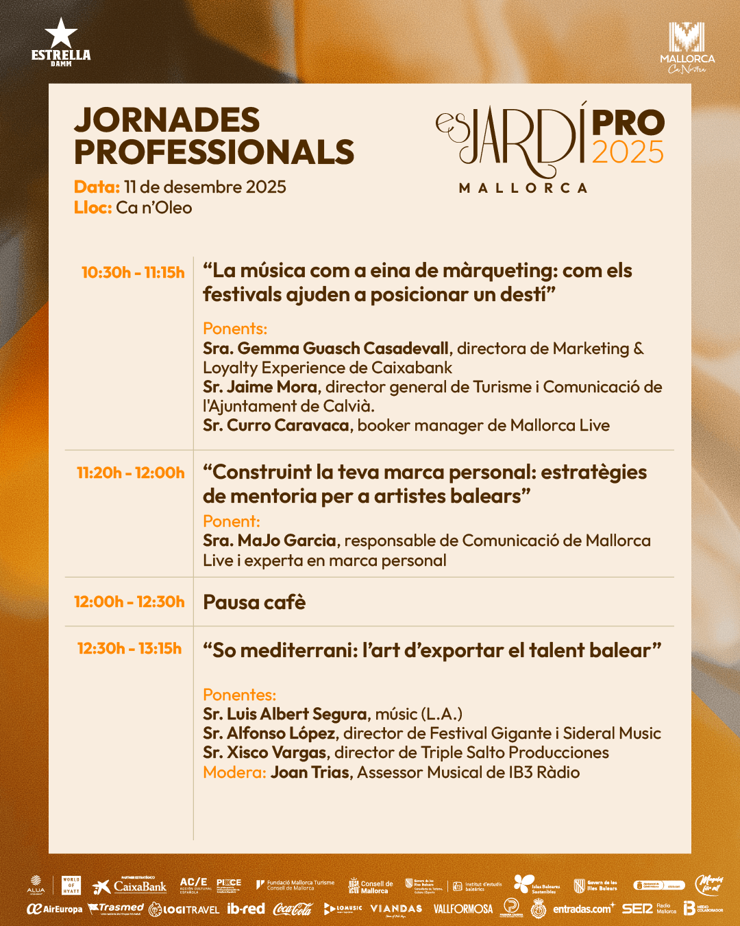 Arriba la segona edició de les jornades professionals presencials d’Es Jardí. Una trobada pensada per compartir temes d’interès entre els agents de la indústria musical i gaudir d’una jornada de networking amb ponents especialitzats del sector. Una cita per aprendre, connectar i continuar impulsant la música.